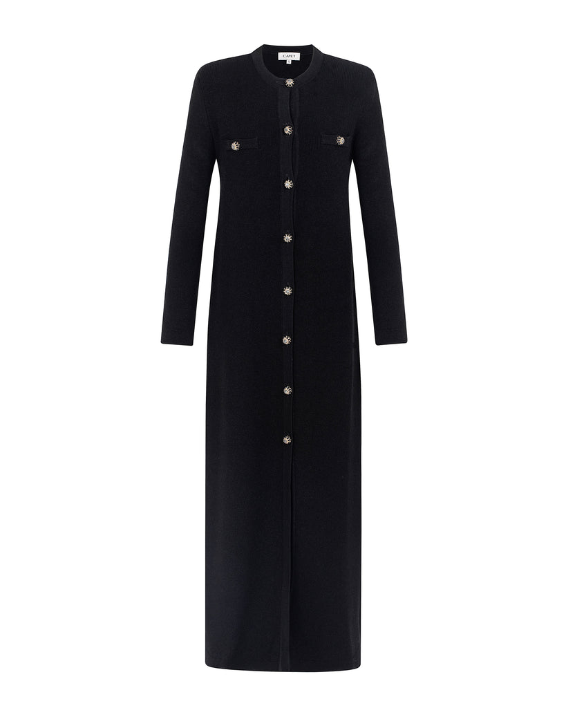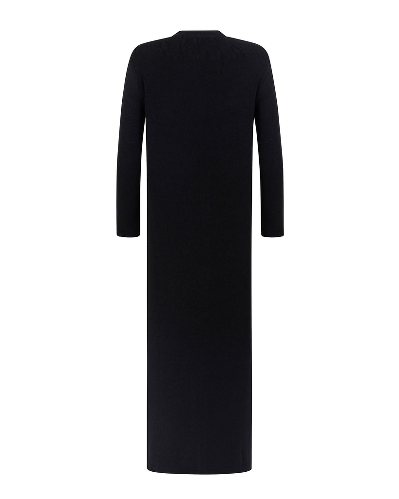 The GISELE cardigan returns in a longer, more dramatic silhouette—now in classic black. Crafted from the same luxe ribbed knit, it offers a fluid drape with a soft, figure-skimming fit. Designed to elevate everyday dressing, its extended length adds elegance and versatility, making it the perfect layering piece from season to season.