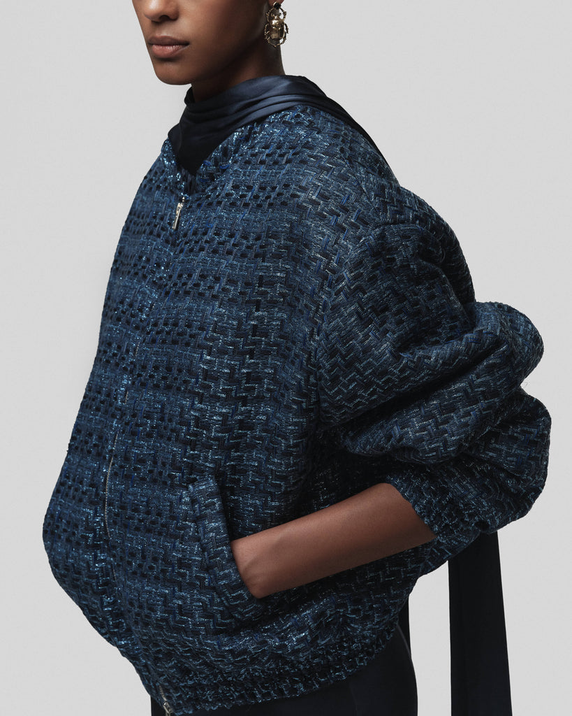 The COBALT bomber is a bold yet feminine silhouette, reimagined in a striking tone: deep cobalt. Crafted in textured jacquard with a sculptural geometric pattern, it plays with light and shadow to echo movement and intention. Voluminous sleeves and a relaxed, oversized fit bring effortless ease and structure. The rose version captures the warmth of twilight, while cobalt evokes a sense of calm power—each offering a distinct take on quiet elegance.