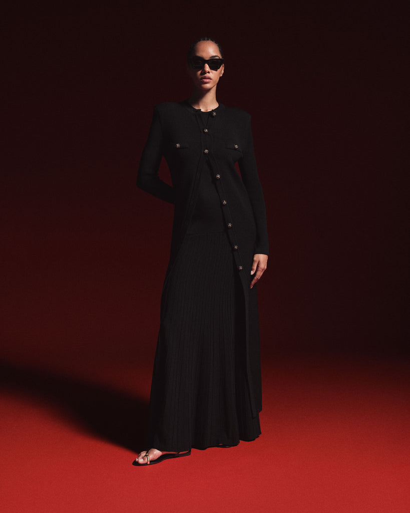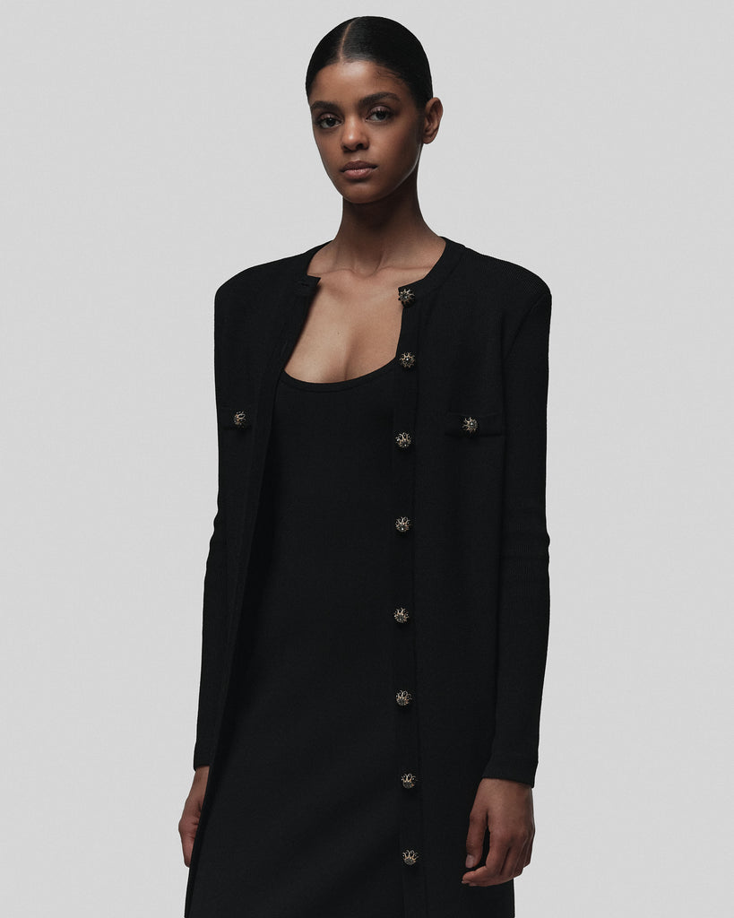 The GISELE cardigan returns in a longer, more dramatic silhouette—now in classic black. Crafted from the same luxe ribbed knit, it offers a fluid drape with a soft, figure-skimming fit. Designed to elevate everyday dressing, its extended length adds elegance and versatility, making it the perfect layering piece from season to season.