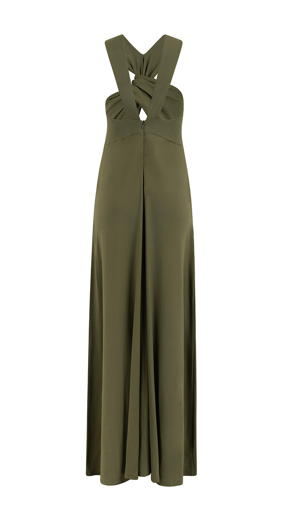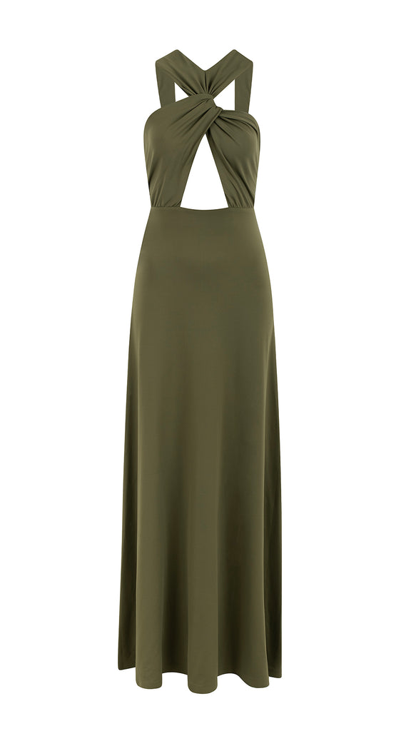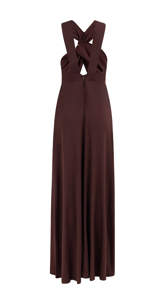 A new version of the NAOMI jersey dress. Designed to captivate with every step. With a front cut and sleeveless design, it exudes effortless sophistication. The fluid skirt flows gracefully, while ruched details add a touch of allure, finishing with two straps in the back. Available in chocolate or olive color.